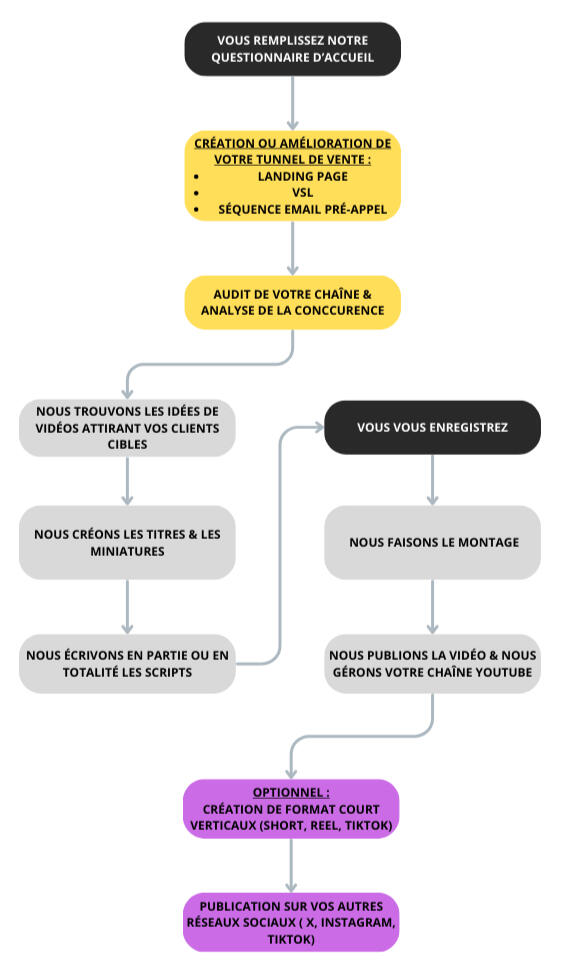 La priorité est de faire du contenu long de qualité (environ 10 minutes). On pourra ensuite développer votre audience via du contenu court (<1min : Short, Reel, TikTok) en parallèle.Le format long est ce qui vous procure des vues organiques, il renforce votre autorité dans votre niche et convertit les prospects (nous nous concentons sur cela en premier lieu).Les formats courts permettent de vous faire découvrir plus facilement mais ne convertissent pas. Nous nous servons des formats courts pour canaliser de nouveaux prospects vers votre format long.